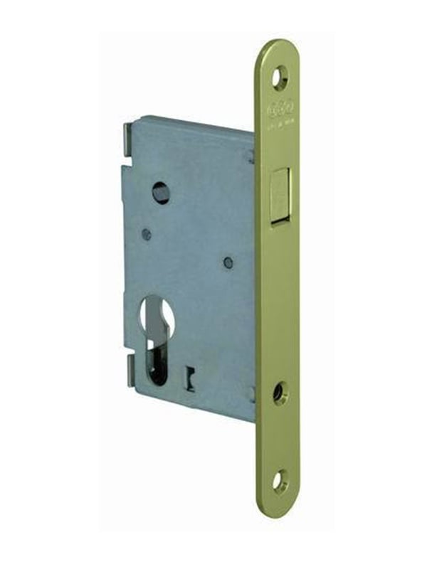 Zámok na posuvné dvere s otvorom pre cylindrickú vložku (PZ). Protiplech k zámku je súčasťou balenia.