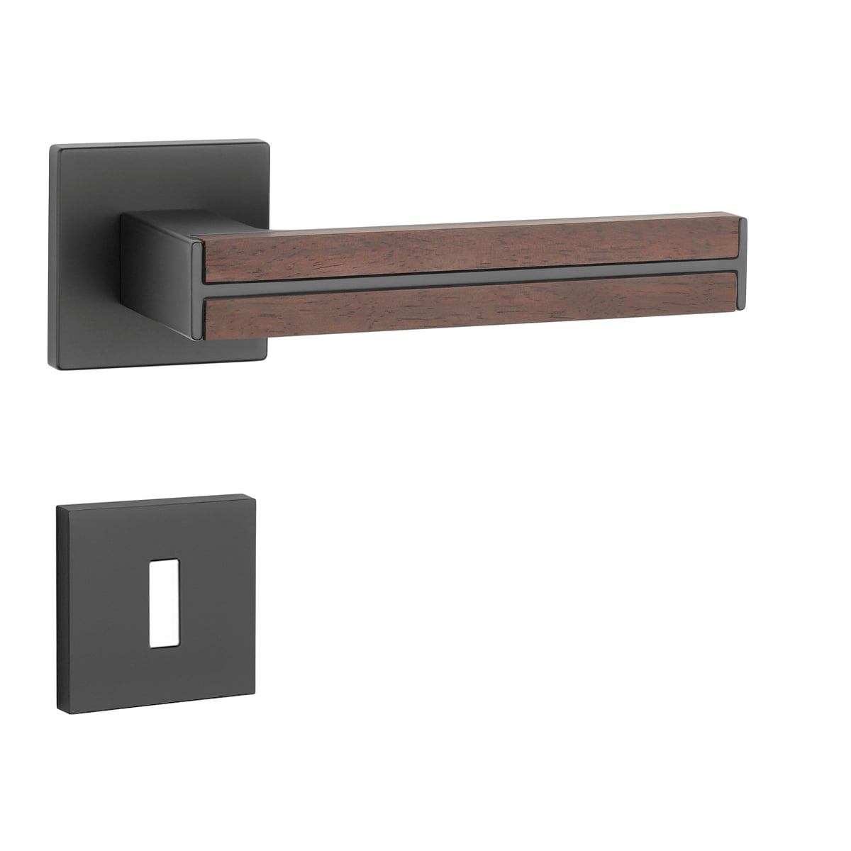 Rozetová kľučka na interiérové dvere s hranatou rozetou je vyrobená z materiálov vysokej kvality – zamak a je povrchovo upravená. Kľučka pôsobí štýlovo a modernisticky, čo podčiarkuje aj kombinácia čiernej farby so santalovým drevom. Tento dekoračný prvok jej dodáva unikátny vzhľad a navodzuje príjemný pocit tepla a prírody.
