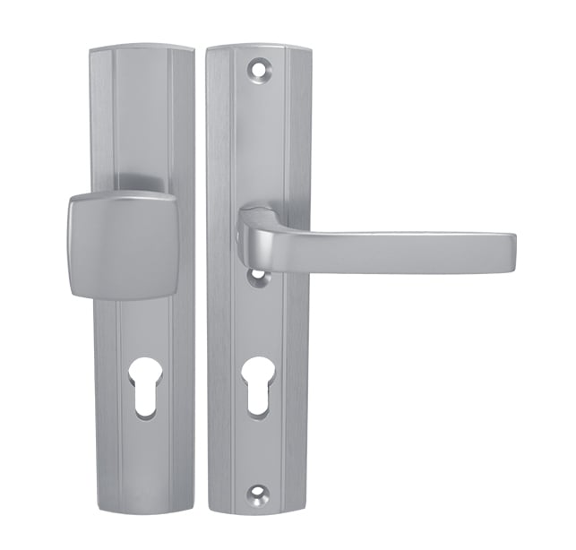Štítová kľučka na vchodové a bezpečnostné dvere s bezpečnostným hranatým štítom bez prekrytia cylindrickej vložky je vyrobená z hliníka a je povrchovo upravená. Hranatý štít má rozmery 52 mm x 242 mm a hrúbku 15 mm.
