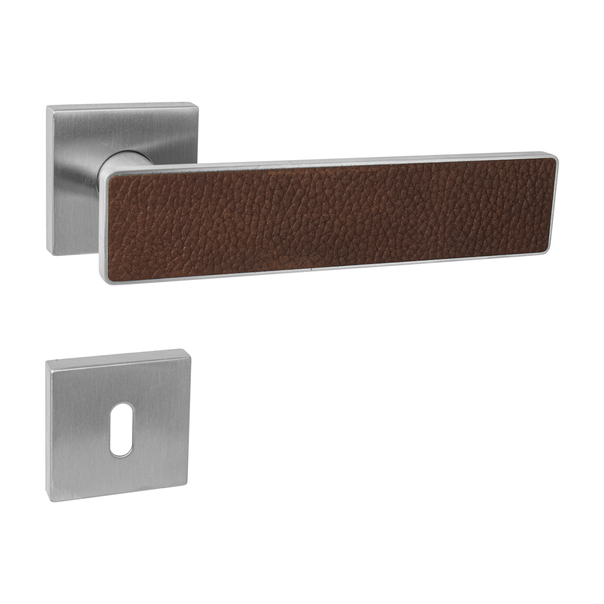 Originálna rozetová kľučka FRAME CONTOUR 436 s hranatou rozetou je vyrobená z vysokokvalitnej nehrdzavejúcej ocele s povrchovou úpravou. Špeciálny efekt vytvára prírodná koža, ktorá zdobí rukoväť kľučky. Je príjemná na dotyk a pôsobivo dotvára každý interiér.