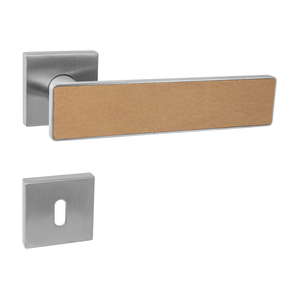 Originálna rozetová kľučka FRAME CONTOUR 436 s hranatou rozetou je vyrobená z vysokokvalitnej nehrdzavejúcej ocele s povrchovou úpravou. Špeciálny efekt vytvára prírodná koža, ktorá zdobí rukoväť kľučky. Je príjemná na dotyk a pôsobivo dotvára každý interiér.