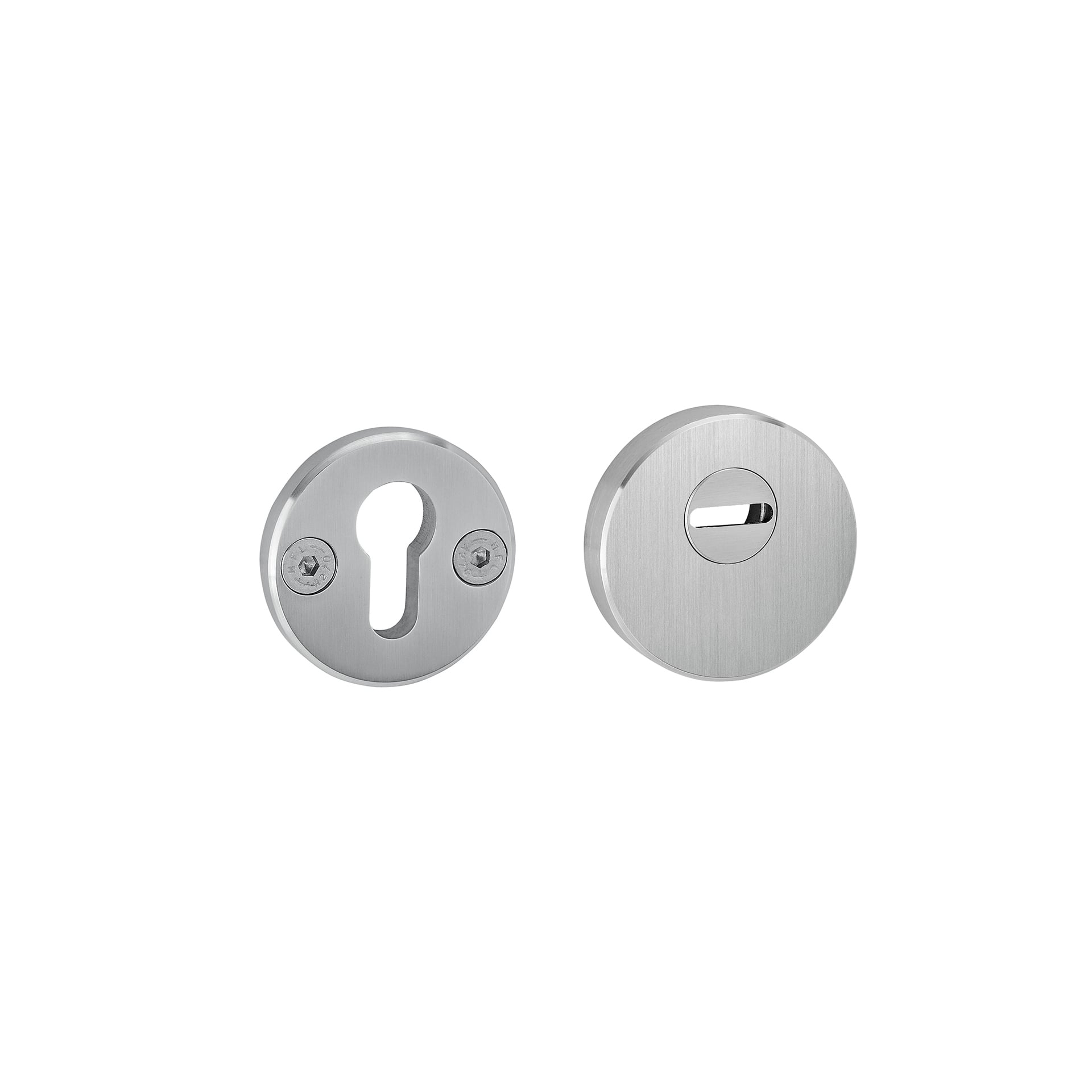 Bezpečnostná okrúhla rozeta s prekrytím cylindrickej vložky je vyrobená z nehrdzavejúcej ocele a a je povrchovo upravená.
