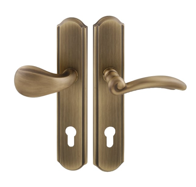 Štítová kľučka na vchodové a bezpečnostné dvere so spevneným rustikálnym štítom bez prekrytia cylindrickej vložky je vyrobená z materiálov vysokej kvality – mosadz a je povrchovo upravená. Rustikálny štít má rozmery 51 mm x 250 mm a hrúbku 12 mm.
