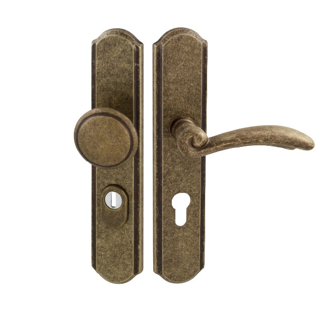 Štítová kľučka na vchodové a bezpečnostné dvere so spevneným rustikálnym štítom s prekrytím cylindrickej vložky je vyrobená z materiálov vysokej kvality – mosadz a je povrchovo upravená. Rustikálny štít má rozmery 51 mm x 250 mm a hrúbku 12 mm.