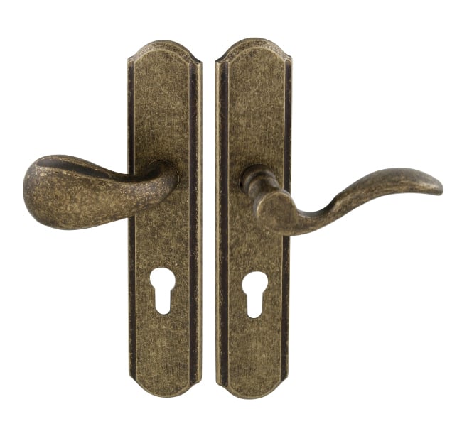 Štítová kľučka na vchodové a bezpečnostné dvere so spevneným rustikálnym štítom bez prekrytia cylindrickej vložky je vyrobená z materiálov vysokej kvality – mosadz a je povrchovo upravená. Rustikálny štít má rozmery 51 mm x 250 mm a hrúbku 12 mm.