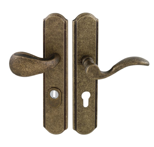 Štítová kľučka na vchodové a bezpečnostné dvere so spevneným rustikálnym štítom s prekrytím cylindrickej vložky je vyrobená z materiálov vysokej kvality – mosadz a je povrchovo upravená. Rustikálny štít má rozmery 51 mm x 250 mm a hrúbku 12 mm.