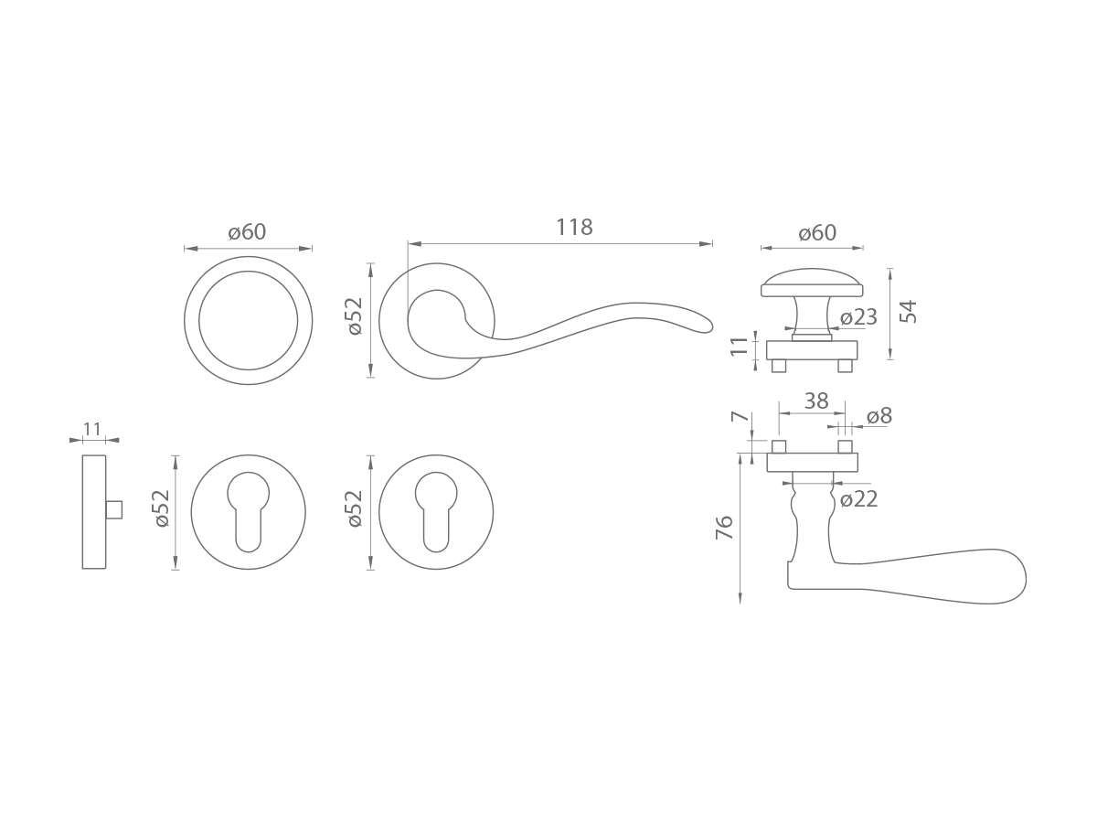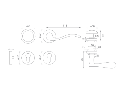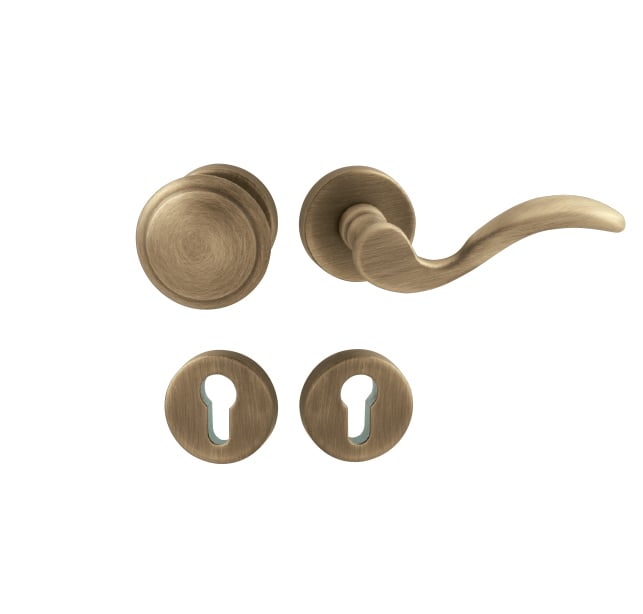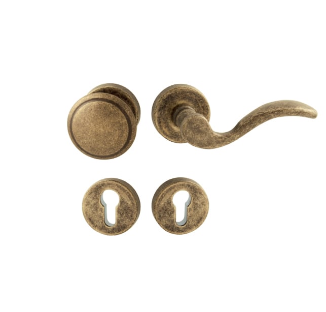 Rozetová kľučka na vchodové a bezpečnostné dvere so spevnenou okrúhlou rozetou bez prekrytia cylindrickej vložky je vyrobená z materiálov vysokej kvality – mosadz a je povrchovo upravená. Okrúhla rozeta má priemer 52 mm a hrúbku 11 mm.