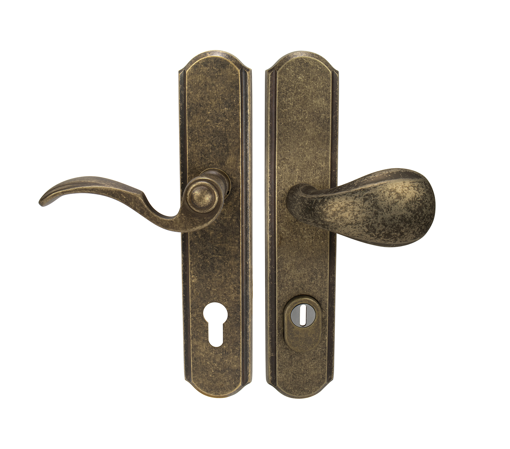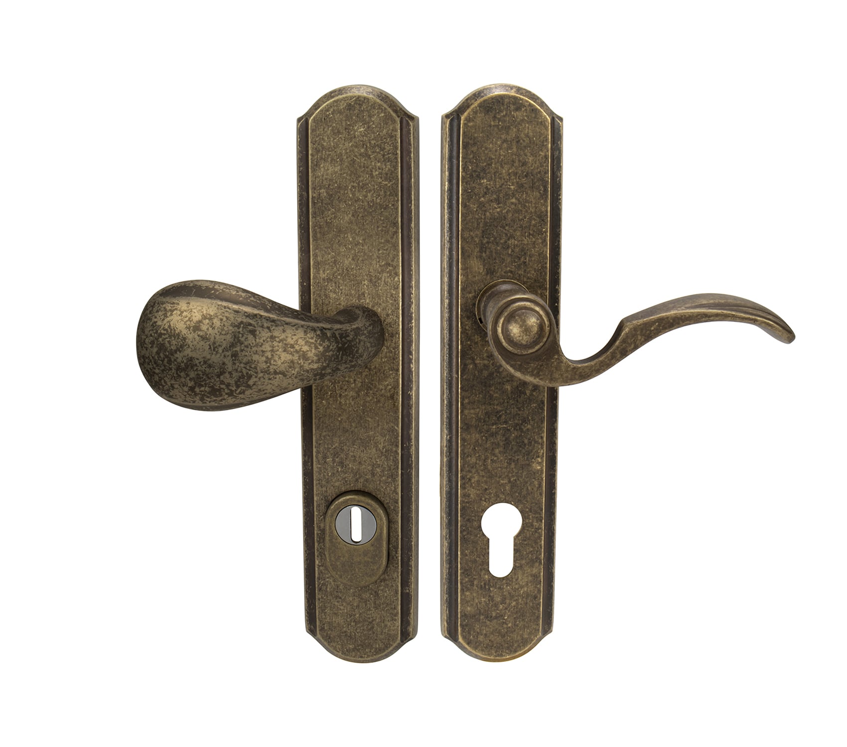 Štítová kľučka na vchodové a bezpečnostné dvere so spevneným rustikálnym štítom s prekrytím cylindrickej vložky je vyrobená z materiálov vysokej kvality – mosadz a je povrchovo upravená. Rustikálny štít má rozmery 51 mm x 250 mm a hrúbku 12 mm.