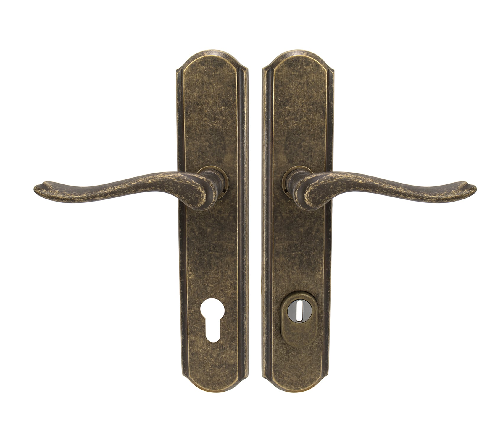 Štítová kľučka na vchodové a bezpečnostné dvere so spevneným rustikálnym štítom s prekrytím cylindrickej vložky je vyrobená z materiálov vysokej kvality – mosadz a je povrchovo upravená. Rustikálny štít má rozmery 51 mm x 250 mm a hrúbku 12 mm.
