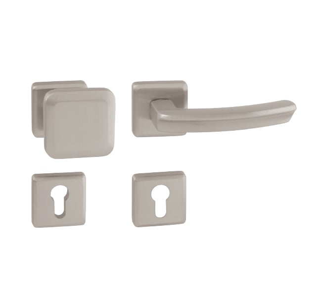 Rozetová kľučka na vchodové a bezpečnostné dvere so spevnenou hranatou rozetou bez prekrytia cylindrickej vložky je vyrobená z materiálov vysokej kvality – mosadz a je povrchovo upravená. Hranatá rozeta má rozmery 53 mm x 53 mm a hrúbku 12 mm.