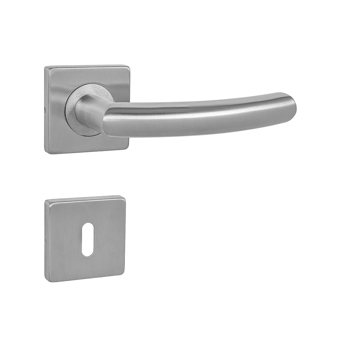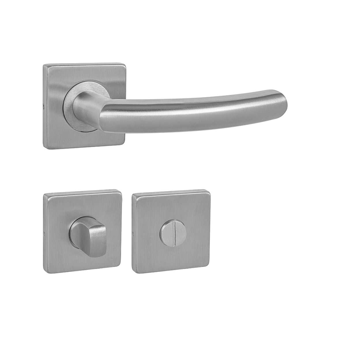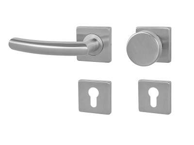 Rozetová kľučka na interiérové dvere s hranatou rozetou je vyrobená z vysokokvalitnej nehrdzavejúcej ocele, známej ako nerez a je povrchovo upravená. Rozeta má rozmery 54 mm x 54 mm a hrúbku 9 mm. Je farebne stabilná a odolná voči opotrebeniu. Kovanie je testované podľa normy ČSN EN 1906:2012 na 200 000 cyklov.