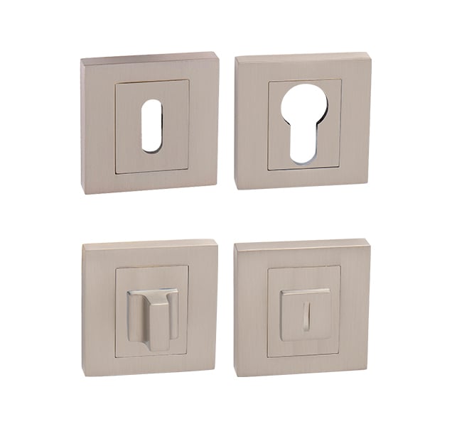 Hranatá rozeta je vyrobená zo zamaku a hliníka a je povrchovo upravená. Rozeta má rozmery 52 mm x 52 mm, hrúbku 10 mm a oválny otvor pre interiérový kľúč (BB), otvor pre cylindrickú vložku (PZ) alebo WC set s vmontovaným kľúčom.Balenie obsahuje 2 kusy roziet (pár) a rozety WC sú v balení ako set.
