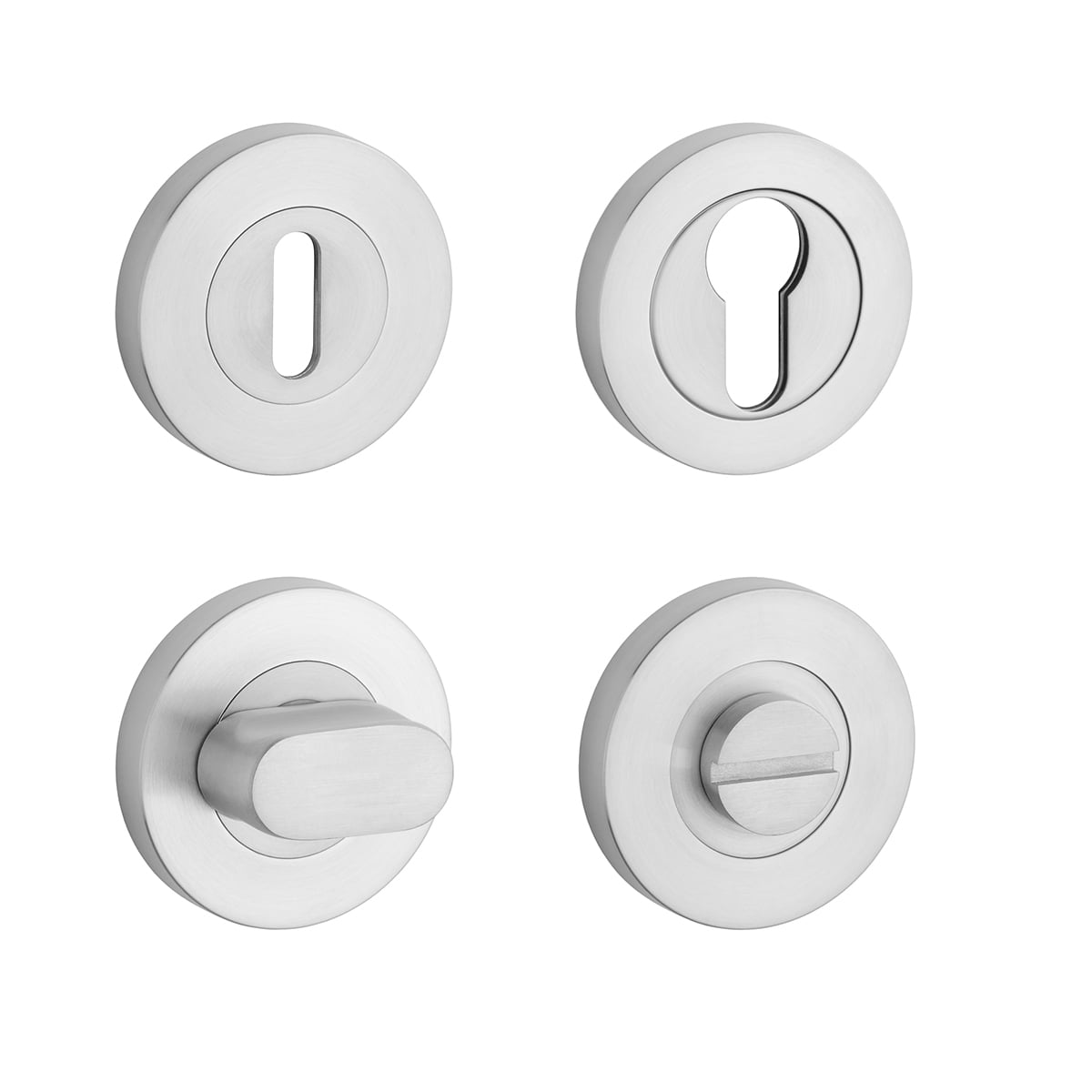 Rozeta má otvor určený pre: interiérový kľúč (BB), cylindrickú vložku (PZ), alebo WC set s integrovaným otočným kľúčom.