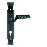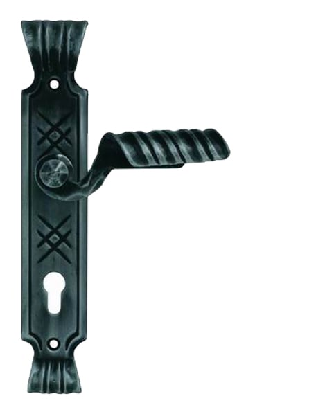 Štítová kľučka na vchodové a bezpečnostné dvere so spevneným kovaným štítom bez prekrytia cylindrickej vložky je vyrobená z kovaného železa a je povrchovo upravená .