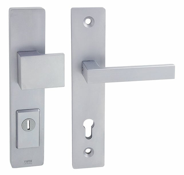 Štítová kľučka na vchodové a bezpečnostné dvere s bezpečnostným hranatým štítom s prekrytím cylindrickej vložky je vyrobená z materiálov vysokej kvality – zamak a je povrchovo upravená. Hranatý štít má rozmery 52 mm x 250 mm a hrúbku 17 mm.